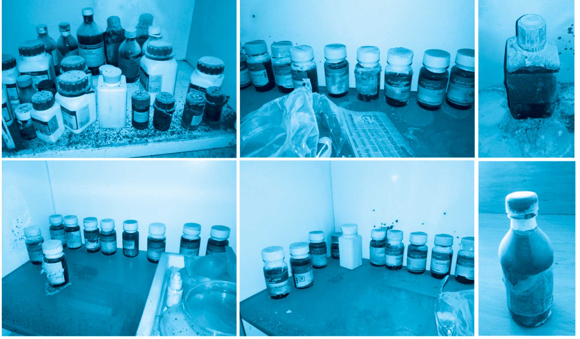 شکل ۱. بخار شدن حلالها، محلولها، مایع و ترکیبهای جامد در آزمایشگاه یکی از مدارس استان تهران. اثر بخارهای شیمیایی روی کمد حاوی مواد و روی مواد دیگر به خوبی نشان داده شده است. اگرچه در بعضی از ظرفها به طور کامل بسته بوده ولی از آنها مواد شیمیایی بهصورت بخار خارج شده است.