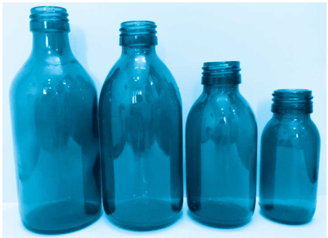 شکل ۲. شیشههای قهوهای رنگ خالی شربت، سوسپانسون و محلولهای دارویی با اندازههای مختلف