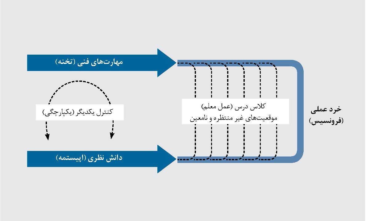 همچنان که در این مدل مشاهده میشود، آنان معتقدند که خرد عملی (فرونسیس) و یا رفتار کردن به شکلی فکورانه بر اثر یکپارچگی و ادغام مهارتهای فنی و نظری، همراه با تجربههای مکرر و واکاوی این تجربهها و تأمل درباره آنها حاصل میشود. به اعتقاد آنان، معلمان دانش‌‌های نظری گوناگون و مهارتهای بیشماری مانند آشنایی با روشهای تدریس مختلف، ساخت آزمون و فن بیان را میآموزند و با آموختن آنها وارد کلاس و تجربه عملی میشوند اما این دانش‌‌های نظری و مهارتها به تنهایی نمیتوانند از آنان حمایت کنند. معلمان در کلاس با موقعیتهای غیرمنتظره، نامعین و منحصربهفردی روبهرو میشوند که دانش و مهارتهایی که تا این زمان آموختهاند. به تنهایی پاسخگوی آنها نیستند. روبهرو شدن با این موقعیتهای غیرمنتظره، معلم را ناگزیر به تأمل فرا میخواند. این تأمل درباره تجربهها و موقعیتها معلم را وارد چرخههای خودپژوهشی، اقدام‌‍‌پژوهی و پژوهشهای عملی از این نوع میکند و با کشاندن او به سوی منابع مختلف، مهارتها، دانش‌‌ها و نگرشهای او را افزایش میدهد و به مرور باعث توسعه خرد عملی او میشود. این تأملات، خودپژوهیها و اقدامپژوهیهای مکرر به تدریج او را به معلمی خردمند تبدیل میکند که میتواند بهترین تصمیمها را برای حل مشکلات پیش روی کلاسش بگیرد.