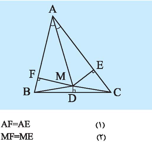 و E پای عمودِ فرود آمده از M بر ضلع AC باشد. مثلث قائمالزاویه AMF و AME به حالت وتر و یک زاویه