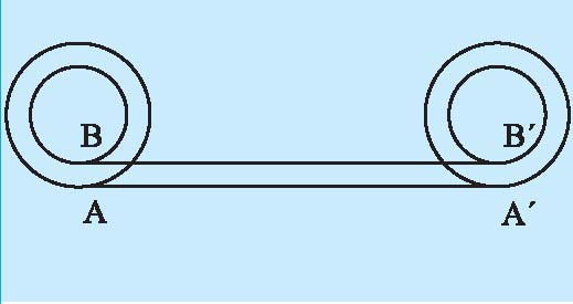 جدید A را Aʹ مینامیم. در این فرایند، A به اندازه محیط دایره بزرگتر را طی میکند تا به Aʹ برسد. پس طول AAʹ برابر با محیط دایره بزرگتر است. با همین استدلال، طول BBʹ برابر با محیط دایره کوچکتر است. چون AAʹ و BBʹ با هم برابرند، نتیجه میشود
