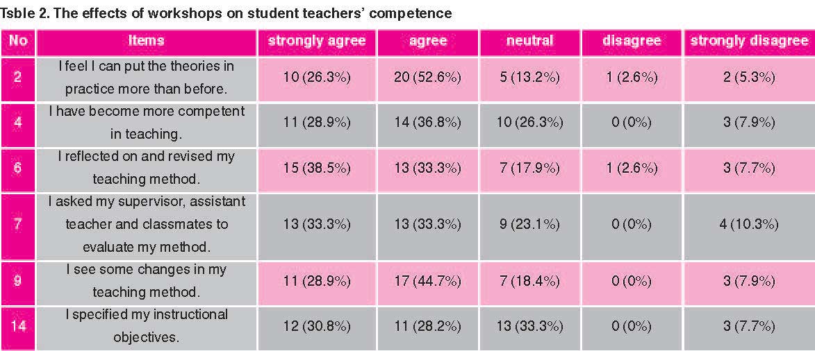 بر شایستگی خود پی برد. علاوه بر این، اکثر دانشجومعلمان باور داشتند که کارگاههای آموزشی، مکمل مناسبی برای دوره