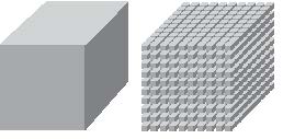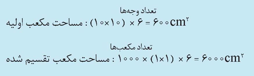 شکل 3. هرچه یک ماده به قطعهةای کوچکتر تقسیم شود، سطم بیشتری از آن برای انجام واکنش شیمیایی در دسارس قرار میگیرد. برای نومنه مساحت مکعبی به ضلع 600cm2، 10cm است. اگر این مکعب به 1000 مکعب کوچکتر به ضلع 1cm تقسیم شود، مساحت آن ده برابر مکعب اولیه خواهد بود: