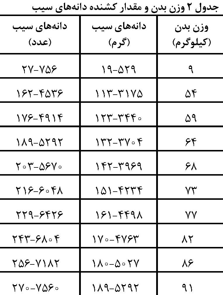 جدول ۲ نشان می‌دهد چه تعداد دانه سیب برای افراد با وزن‌های متفاوت کشنده است.