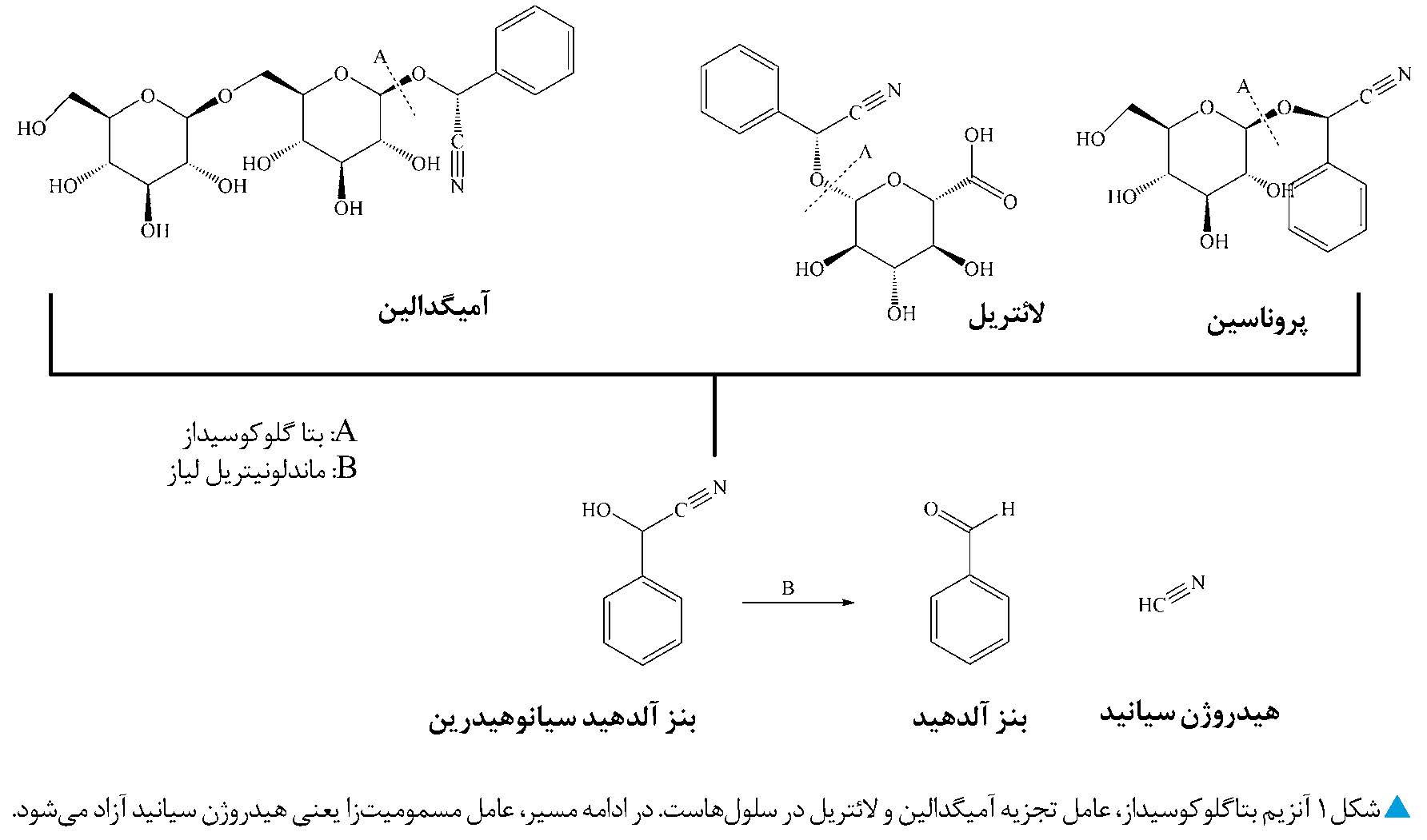 درختان سیب کشت آسان و تنوع فراوانی دارند. میوه سیب با خواص پاداکسندگی(آنتی اکسیدان)، از بدن در برابر سرطان و تخریب سلول‌ها محافظت می‌کند. گفته می‌شود مصرف یک عدد سیب در روز، بیماری‌ها را از ما دور نگه می‌دارد. این میوه خوش‌طعم، دانه‌های کوچک و سیاهی دارد که چون طعم تلخی دارند، به‌طورمعمول خورده نمی‌شوند. با این‌حال ممکن است گاه و بی‌گاه به‌صورت تصادفی خورده شوند. این دانه‌ها شامل ماده شیمیایی شناخته شده‌ای به نام آمیگدالین۱ هستند که ماده بی‌ضرری است و به‌طور تقریبی در دانه تمام میوه‌ها مانند زردآلو، هلو و آلبالو وجود دارد، جدول ۱. جویدن دانه این میوه‌ها سبب واکنش آمیگدالین با اکسیژن، و آزاد شدن هیدروژن سیانید می‌شود، شکل ۱. سیانید یا سیانور ماده‌ای بسیار سمّی و کشنده است. این ماده در طول تاریخ به‌عنوان سمّی مرگ‌آور، در جنگ‌های شیمیایی یا برای از پا در آوردن خویش استفاده شده است.