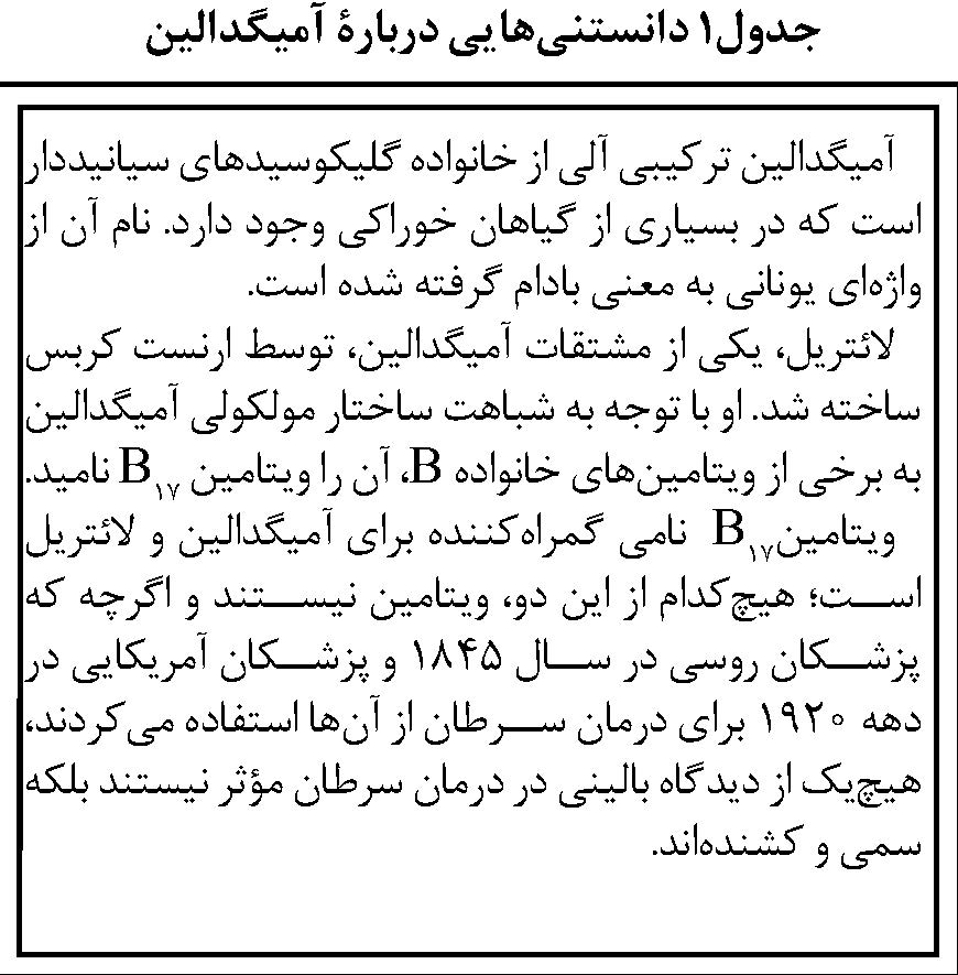 در سال ۱۹۵۵ ارنست کربس۴، نام ویتامین  B۱۷ را به آمیگدالین نسبت داد که البته به دلیل شباهت ساختاری آن به ساختار مولکولی برخی از اعضای خانواده این ویتامین‌ها بود، شکل ۲. دو دهه بعد، مدیر روابط عمومی شرکت اسلوان کترینگ۵، رالف ماس۶، موثر بودن آمیگدالین در درمان سرطان را به چالش کشید و در پی آن سازمان جهانی غذا و داروی آمریکا، FDA، فروش این ماده را ممنوع اعلام کرد.