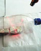 وسایل لازم: یک بطری پلاستیکی مثل بطری نوشابهی خانواده؛ چراغقوهی لیزری؛ دو ورق کوچک آلومینیومی (مثل روکش کیک) یکی صاف و دیگری چروک؛ کبریت.
