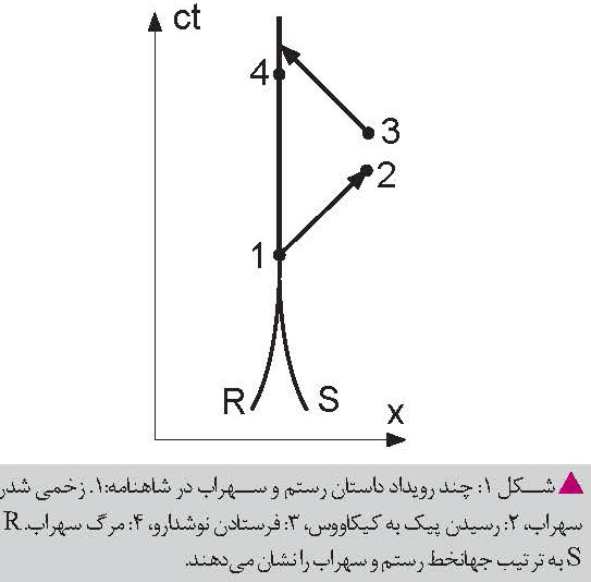 شکل ۵ همچنین یک روایت دیگر از شاهنامه را در حضور سیاهچاله نشان می‌دهد. در این روایت تهمینه و سهراب خارج از افق از هم جدا می‌شوند؛ تهمینه به دوردست‌ها سفر می‌کند و سهراب در جست‌وجوی رستم رهسپار سیاهچاله می‌شود. از قضا رویداد مرگ سهراب دقیقاً روی افق رخ می‌دهد. همه وقایع بین ملاقات رستم و سهراب و مرگ سهراب از نظر خود آن دو در زمانی متناهی روی می‌دهند. اما تهمینه چه می‌بیند؟ به نمودار نگاه کنید و به سیگنال‌های رادیویی تصاویر زنده‌ای که سهراب برای مادرش ارسال می‌کرده دقت کنید. تهمینه این سیگنال‌ها را در زمانی نامتناهی دریافت می‌کند.۳ به عبارت دیگر تهمینه حتی اگر بی‌نهایت سال عمر کند، هرگز از مرگ سهراب باخبر نخواهد شد؛ مانند یک داستان با پایان باز، همیشه منتظر خواهد ماند شاید روزی ببیند که نوشدارو به سهراب رسیده؛ و در یک رنج بی‌پایان صحنه بی‌نهایت آهسته آخرین لحظات عمر فرزندش را تا ابد به تماشا می‌نشیند.