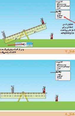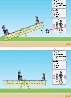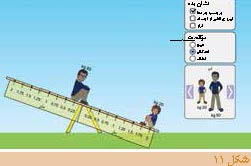 حال به دانشآموزان بگویید، عواملی را که موجب گشتن جسم به دور محور میشوند، گشتاور نیرو مینامند. تا این مرحله، دانشآموزان متوجه شدهاند عواملی که موجب گشتن الاکلنگ میشوند وزن و مکان قرار گرفتن جسم در الاکلنگ هستند. برای آنکه در این زمینه تجربههای بیشتری بهدست آورند، از آنها بخواهید روی بخش «آزمایشگاه گشتاور» کلیک کنند (شکل ۶). در این قسمت، اشیا و تصویرهای متنوعتری قرار دارد (مانند وزنههای مختلف، تصویر پدر و پسر و مادر و دختر). برای مثال، از دانشآموزان بخواهید در یک طرف الاکلنگ پدر ۸۰ کیلویی را قرار دهند و در طرف دیگر پسر ۲۰ کیلویی را بنشانند. چه اتفاقی میافتد؟ واضح است که الاکلنگ در طرفی که پسر نشسته است به بالا گردش میکند. از دانشآموزان بخواهید مکان پدر و پسر را طوری تنظیم کنند که الاکلنگ به حال تعادل بایستد. دانشآموزان بعد از چند بار جابهجایی پدر و پسر روی الاکلنگ، نقطه تعادل را پیدا میکنند. برای مثال، اگر پدر ۸۰ کیلوگرمی درنیم سانتیمتری تکیهگاه قرار گیرد و پسر ۲۰ کیلوگرمی در ۲ سانتیمتری تکیهگاه نشسته باشد، الاکلنگ به حال تعادل میایستد (شکل ۱۰).