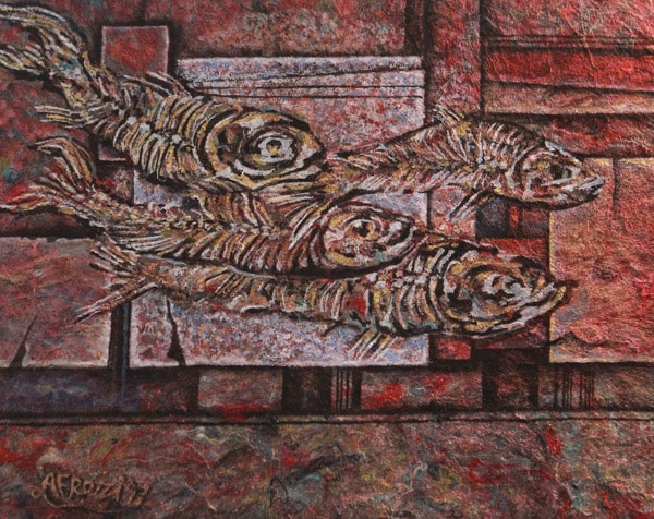 آثار نقاشی آقای مظاهر ولیزاده شامل تابلوهایی است که چهرهها و حالتهای مختلف ماهی و ماهیان را به تصویر درآورده است. تکنیک کار ایشان استفاده از خردهنخها و پشمهای قالی و ترکیب مواد بر روی بوم است. در این فن خردهپشمها با چسب بر روی بوم زیرسازی میشود و سپس، با تثبیت آنها، طرح مورد نظر روی آنها اعمال میشود و پس از آن به رنگآمیزی طرحها مبادرت میشود. ولیزاده بر این باور است که «در درجه اول کارهایش باید مورد تفسیر و تحلیل و برداشت شخصی مخاطب قرار گیرد بنابراین از ارائه هرگونه پیامی در تابلوهایش پرهیز میکند. با این حال در کارهای وی آبزیان و ماهیانی که هماکنون و در گذر قرنهای طولانی به فسیل تبدیل شده و معلق ماندهاند قابل بررسی است. به همین دلیل «ماهی» و «فسیل» درونمایه اصلی آثار آقای ولیزاده را تشکیل میدهد. در این نمایشگاه ولیزاده از کارهای دو دهه پیش خود نیز مواردی را آورده که روند تحول و تحصیل هنری وی را میتوان ردیابی کرد.