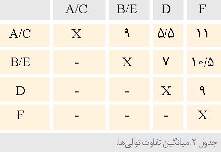 ۶. در این مرحله مجدداً هر توالی را با گروههای جدید مقایسه میکنیم (مقایسه توالیها با گروه A-C و نیز با گروه B-E و یادداشت آن در جدول شماره ۲). به عنوان مثال در مورد گروه A-C ، تفاوت هر توالی را با A و با C جمع میکنیم و آن را میانگین میگیریم. سپس اعداد را در جدولی مانند جدول ۲ یادداشت میکنیم؛ مثلاً، B با هر کدام از A و C ۹ تفاوت دارد؛ پس میانگین تفاوت B با A/C هم ۹ میشود. سپس همین کار را برای شاخه B/E نیز انجام میدهیم. میانگین تفاوت نوکلئوتیدهای هر خانه از جدول را در محل تقاطع آنها مینویسیم.