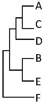 ۱۱. تنها توالی F که دارای بیشترین تفاوت با گروههای ایجادشده است، باقی میماند که آن را به گروههای قبلی (درخت فیلوژنی) اضافه میکنیم: (F بیشترین اختلاف و کمترین شباهت را با توالیهای دیگر دارد).