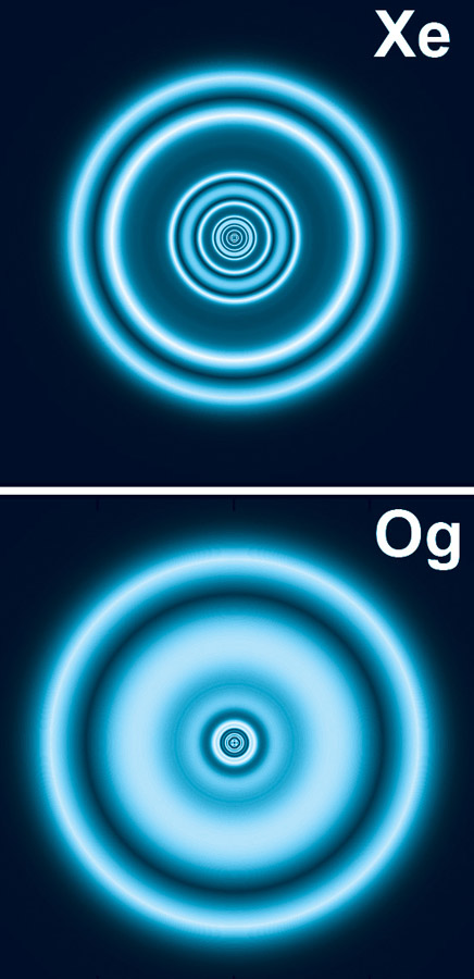 دانشمندان این واقعیت را به کمک اثرهای نسبیتی توضیح دادهاند. بنا به مدل اتمی بور، در ساختار اتمی همه عنصرها الکترونها در فاصله معینی از هسته- که لایههای الکترونی را معرفی میکنند- پیرامون هسته در گردشاند. شکل ۶ تابع مستقر الکترونها را در اتم زنون و اوگانسون، بنا به محاسبات نسبیتی اتمی نشان میدهد. لایههای الکترونی در گاز زنون بهصورت دایره، به روشنی قابل تشخیصاند در حالی که مدارها بهعنوان الگوهای معمول و شناختهشده در اتمها، در اوگانسون دیده نمیشوند، اثری از لایه الکترونی خارجی نیست و به نظر میرسد همه لایهها با هم ادغام شدهاند و بهصورت لکهای یکپارچه درآمدهاند. انتظار میرود وجود چنین تفاوتی میان ساختار اتمی اوگانسون با دیگر اعضای خانوادهاش، عامل اصلی بروز تفاوتهای چشمگیر در ویژگیهای فیزیکی و شیمیایی میان آنها باشد [۳]. برای نمونه، اوگانسون برخلاف گازهای همگروهیاش الکترونخواه است و با اتمهای دیگر پیوند تشکیل میدهد.