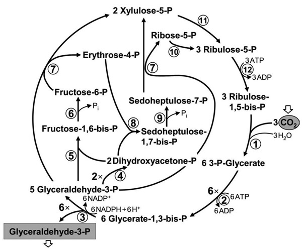 این چرخه مهمترین و پرکاربردترین مسیر تثبیت CO۲ است که در یوکاریوتهای اتوتروف، سیانوباکتریها، بسیاری از پروتئوباکتریهای هوازی یا هوازی اختیاریِ متعلق به زیرگروههای آلفا، بتا و گاما، برخی مایکوباکتریها و برخی باکتریهای غیرگوگردی سبز وجود دارد. واکنشهای آنزیمی چرخه کالوین در یوکاریوتهای اتوتروف در بستره کلروپلاست و در سیانوباکتری، برخی باکتریهای شورهگذار و تیوباسیلها در ساختارهایی چندوجهی موسوم به کربوکسی زوم۲ انجام میشوند. در چرخه کالوین به ازای تثبیت هر سه مولکول CO۲، یک مولکول گلیسرآلدهید ۳ـ فسفات تولید میشود. طی این واکنشها برای تثبیت هر مولکول CO۲، سه مولکول ATP و دو مولکول NADPH مصرف میشود (شکل ۱).