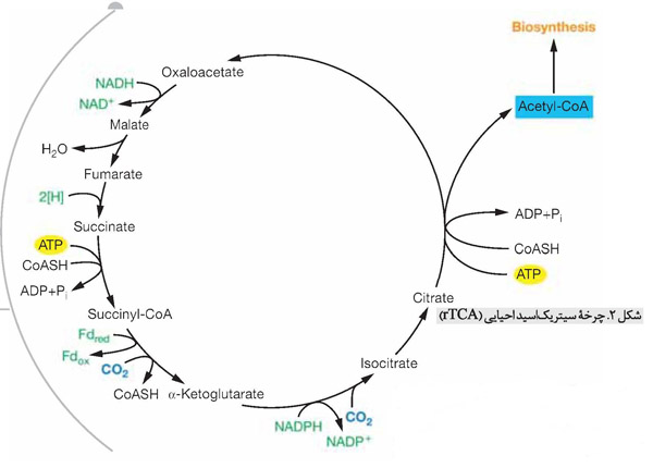 چرخه سیتریکاسید احیایی درواقع در جهت مخالف یا معکوس چرخه کربس انجام میگیرد. البته با توجه به برگشتناپذیر بودن برخی از واکنشهای چرخه کربس، این واکنشها با آنزیمهای دیگری در جهت معکوس پیش برده میشوند. این روش تثبیت CO۲ در باکتریهای گوگردی سبز، پروتئوباکتریها بهویژه زیرگروههای دلتا و اپسیلون، نیتروسپیرا۶ و هیدروژنوباکتر ترموفیلوس (نوعی باکتری اکسیدکننده هیدروژن) دیده میشود. در چرخه سیتریکاسید احیایی بهازای تثبیت دو مولکول CO۲ یک مولکول استیل کوآنزیم A تولید میشود. استیل کوآنزیم A حاصل شده برای سنتز مولکولهای آلی دیگری همچون پیرووات، فسفوانول پیرووات و اگزالواستات مورد استفاده قرار میگیرد (شکل ۲).