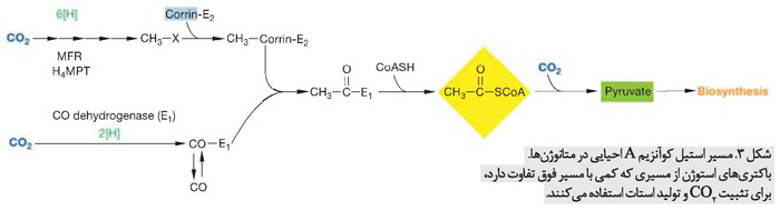در این روش که بهصورت خطی و غیر چرخهای است، دو مولکول CO۲ بهصورت یک مولکول استیل کوآنزیم A تثبیت میشوند. این مسیر در برخی آرکیباکتریهای متانوژن، باکتریهای استوژن و باکتریهای دیگری همچون برخی پلانکتومیستها۸ و اسپیروکتها۹ دیده میشود. تاکنون چندین نوع مسیر استیل کوآنزیم A احیایی شناسایی شده است که از نظر نوع کوآنزیم و حاملهای الکترونی با یکدیگر تفاوت دارند. در این مسیرها از آنزیمها و کوآنزیمهای غیرمعمولی همچون کربنمونوکسیددهیدروژناز۱۰، تتراهیدروپترین۱۱ (H۴PT)، تتراهیدروفولات۱۲ (THF)، متانوفوران۱۳ (MFR)، تتراهیدرومتانوپترین۱۴ (H۴MPT) و کوآنزیم F۴۲۰استفاده میشود. در این مسیر، نسبت به سایر مسیرهای تثبیت CO۲، کمترین میزان مصرف انرژی دیده میشود؛ بهطوری که برای تثبیت هر دو مولکول CO۲ یک مولکول ATP و چهار مولکول NADPH مصرف میشود (شکل ۳).