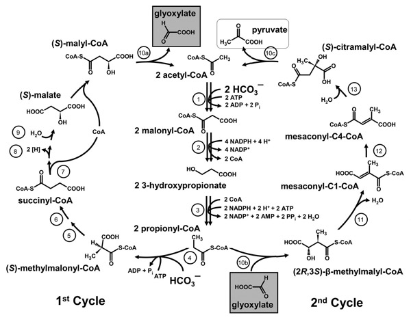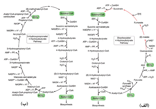 سولفولوبوس۱۹ که نوعی آرکیباکتری است از این چرخه برای تثبیت CO۲ استفاده میکند. این چرخه شبیه به چرخه دیکربوکسیلات ۴ـ هیدروکسی بوتیرات است و بخشی از مسیر تثبیت در هر دو یکسان است (شکل ۴ الف و ب). تفاوت از نظر نوع آنزیم کربوکسیله کننده است و اینکه در این چرخه از دو مولکول HCO۳ برای تثبیت استفاده میشود. طی چرخه ۳ـ هیدروکسی پروپیونات ۴ـ هیدروکسی بوتیرات یک مولکول استیل کوآنزیم A از تثبیت دو اتم کربن (بهصورت HCO۳) ساخته میشود. در این چرخه دو آنزیم تثبیتکننده CO۲ وجود دارد: استیل کوآنزیم A کربوکسیلاز و پروپیونیل کوآنزیم A کروکسیلاز. در این چرخه برای تولید هر مولکول استیل کوآنزیم A، ۴ مولکول ATP (۶ پیوند پرانرژی) و ۴ مولکول NADPH مصرف میشود.