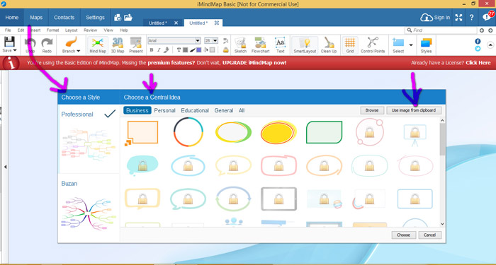 ۱. از طریق این مسیر در برنامه، میتوان از قالبهای نمونه برای طراحی نقشه مفهومی استفاده، یا فایلهای طراحی شده قبلی را دوباره مشاهده کرد. میتوان برای مفهوم اصلی در نقشههای مفهومی، از تصاویر و اشکال مختلف براساس نیاز استفاده کرد (شکل ۱).