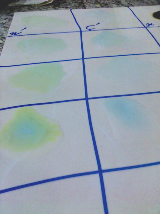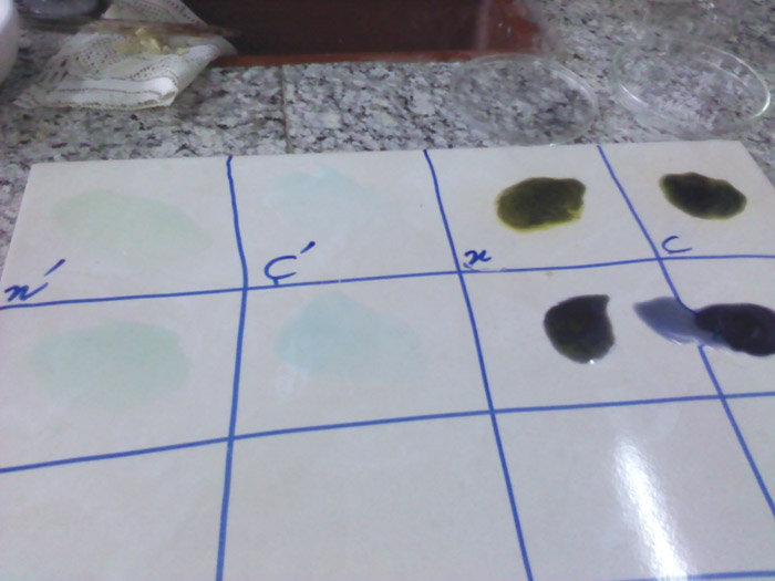 ۱۰. قطرات نشاسته را روی کاشی سفید به طرز جداگانه قرار میدهیم و یک قطره از محلول ید در هر قطره محلول نشاسته میریزیم و تغییرات آن را مشاهده میکنیم.