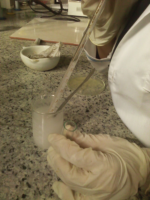 ۲. ml ۱۰ آب مقطر به آن میافزاییم و به طور کامل مخلوط میکنیم.