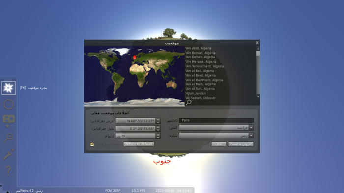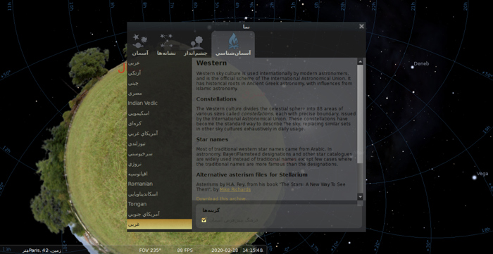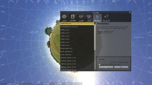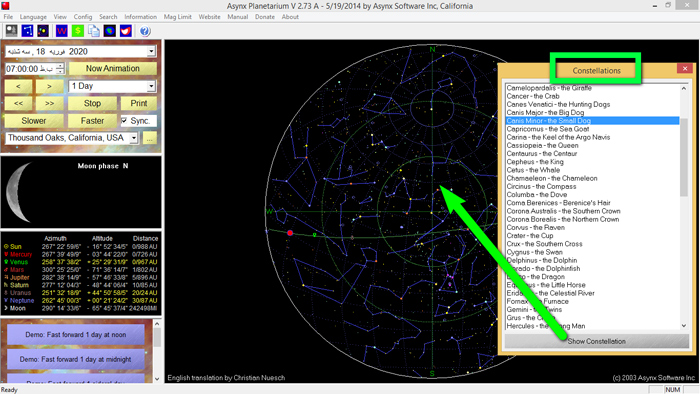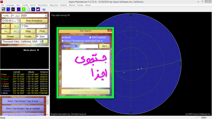این نرمافزار برای علاقهمندان به نجوم و ستارهشناسی بسیار جالب است. چرا که موقعیت 2550 ستاره، 80 منظومه، و ماه و سیارههای منظومه شمسی را، از سال 1600 تا سال 9999 میلادی، بر اساس موقعیت ما در کره زمین نشان میدهد (تصویر1).