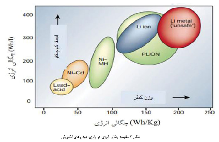 اتصال سری و موازی سلولهای الکتروشیمیایی موجود در باتری، ظرفیت و ولتاژ مورد نیاز سیستم را فراهم میسازند. هر سلول متشکل از الکترود مثبت، الکترود منفی و الکترولیت است و در آن حرکت الکترونهای آزاد شده طی واکنش شیمیایی، منجر به ایجاد جریان الکتریکی میشود. در (شکل 3)، چگالی انرژی و سیر تحولی انواع باتریها نشان داده شده است. همانطور که در شکل مشاهده میشود، باتریهای سربـ اسیدی (LABs) و نیکل کادمیوم (Ni-Cd) در حالی که حجم و وزن بیشتری داشتند، از چگالی انرژی پایینتری برخوردار بودند. بر پایه تحقیقات انجام شده با وجود اینکه استفاده از باتریهای نیکلـ هیدرید فلز6 بسیار مرسوم است ولی باتریهای لیتیوم یونی که در سه دسته لیتیوم یونی7، پلیمر لیتیوم یون8 و لیتیوم فلزی9 قرار دارند با دوبرابر بازده، چگالی انرژی بیشتری را فراهم میسازند که به این ترتیب با توجه به حجم کوچک، وزن سبک و قیمت مناسب، گزینه مناسبی جهت استفاده در خودروهای الکتریکی قابل شارژ محسوب میشوند [5].