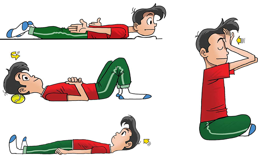 - یک توپ کوچک مثل توپ تنیس زیر بخش قاعدهای(مثل شکل) سرتان بگذارید و آرام شروع به چرخاندن سرتان روی زمین با کمک توپ بکنید. در این حالت باید کمی احساس فشار در ناحیه گردن داشته باشید و سعی کنید این کار را 4-5 دقیقه انجام دهید و سر را هم به طرف چپ و هم راست بچرخانید. البته اگر موقعی که اینکار را انجام میدهید، سرتان گیج میرود یا احساس درد شدید میکنید، باید ورزش را قطع کنید، چون بدنتان با این علامتها میگوید که شما هنوز آماده نیستید.