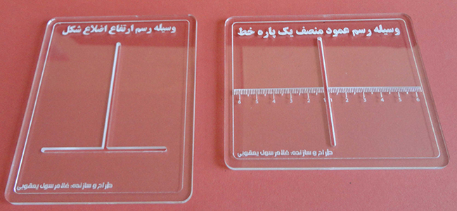 من اسم این وسیله را رسمکننده عمودمنصف ضلعهای شکل و پارهخطها گذاشتهام. به کمک این وسیله خیلی ساده و بدون استفاده از پرگار و گونیا میتوان عمودمنصف ضلعها و پارهخطها را رسم کرد. این وسیله به دلیل ارزانی و استفاده بسیار راحت از آن، دانشآموزان را در این درس تشویق میکند که مسائل مربوطه را با اشتیاق حل کنند. چون دغدغه تهیه و استفاده از گونیا و پرگار را ندارند. به هر حال دانشآموزانی هستند که یا توان خرید دو یا سه وسیله را ندارند و یا کار با آنها برایشان مشکل است.