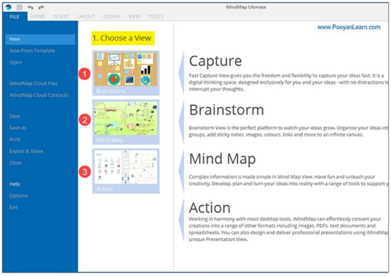 ابتدا نرمافزار iMindMap9 را از سایتهای معتبر دانلود و نصب کنید. برنامه را اجرا کنید. سه گزینه در مقابل خود میبینید (طبق شکل 1). هر گزینه بیانگر بخشی از توانمندیهای این نرمافزار است. ما تنها در مورد نحوهی استفاده از بخش نقشهی ذهنی (MindMap)