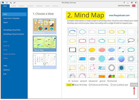برای رسم نقشهی ذهنی روی MindMap کلیک کنید. میتوانید از قسمت پایین Style را تغییر دهید. برای پسزمینهی کار میتوانید از الگوهای موجود در سیستم خود یا الگوهای پیشفرض نرمافزار استفاده کنید. حالا ایدهی اصلی در مرکز صفحه قرار میگیرد. در اینجا من یک تصویر از سیستم خودم انتخاب کردهام.