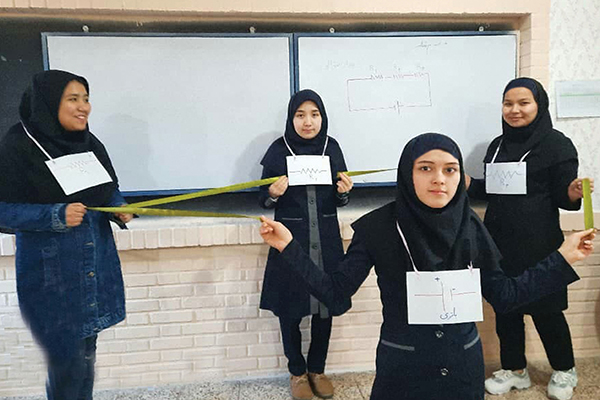 از همان دانشآموزان که نقش باتری و سه مقاومت را دارند و کاملاً تمرین کردهاند، درخواست میکنم مثل مدار الکتریکی که روی تخته کشیدهام بایستند. دو مقاومت متوالی دست به دست هم با سومی موازی، طوری که دست راست مقاومت اولی و دست چپ مقاومت دومی در دستان مقاومت سومی باشد و دو طناب از گره دستان آنها به دستان باتری وصل شود (دقت دانشآموزان به چیدمان مقاومتها و چرخش چشمانشان بین تخته و گروه نمایش دیدنی است).