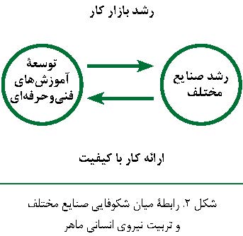 باید توجه داشت که شکوفایی صنایع مختلف با توسعه رشتههای فنیوحرفهای ارتباط مستقیم و تنگاتنگی دارد. شکل 2 این ارتباط را که به شدت جنبه همافزایی دارد، نشان میدهد. هر چه افراد ماهرتر و با قابلیتهای بیشتر تربیت شوند، صنایع رشد سریعتری خواهند داشت.