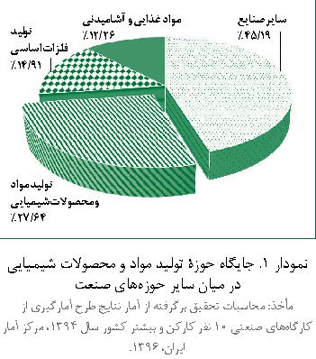 طبق برآوردهای مرکز آمار، حوزه تولید مواد و محصولات شیمیایی در میان سایر حوزههای صنعت، با ۶۴/۲۷ درصد بیشترین مقدار را به خود اختصاص داده که این امر حاکی از سودآوری بالای صنایع شیمیایی است. (نمودار 1)
