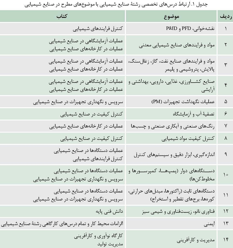جدول 1 نشان میدهد که تقریباً تمامی موضوعهای اصلی و مهم در صنایع شیمیایی در کتابهای درسی این رشته پوشش داده شدهاند و علاوه بر درسهای عمومی عمدتاً طی سالهای دهم تا دوازدهم رشته صنایع شیمیایی تدریس میشوند. باید به این نکته توجه داشت که بخش عمده مطالبی که در پودمانهای کتابهای درسی ذکر شدهاند، جنبه نظری ـ عملی دارند و بسیاری از مباحث، نظیر PFD، که بسیار کاربردی است حتی در دورههای کارشناسی نیز تدریس نمیشوند. (2) و (1)