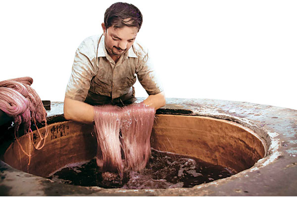 این همان «پاتیل» معروف رنگرزی است. اما بر خلاف آنچه میگویند، کار پای پاتیل یا خم رنگرزی آنقدرها هم آسان نیست. رنگرز کلافها را در حالی در دیگ میچرخاند تا به خود رنگ بگیرند، که شعله زیر دیگ روشن است و آب در حال جوشیدن. رنگرزها به این کار «هموار کردن» میگویند. کمردرد از عوارض پای پاتیل ایستادن است، چرا که برای هموار کردن کلاف باید روی پاتیل خم شد. به همین خاطر است که معمولاً جوانترها پای پاتیل میایستند.