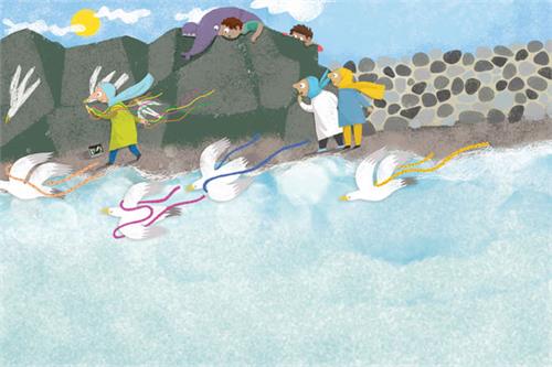 کمی بعد، همهی بچّهها با روبانهایی روی دستهایشان، صخرهها را پر از شکلهای مرغ دریایی، درخت و پرواز کردند.