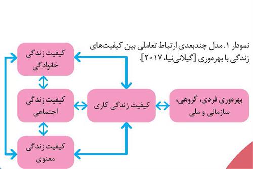 گیلانینیا (2017) جنبههای متفاوت کیفیت زندگی انسان را که بر هم تعامل میکنند، در چهار حوزه عمده در نظر گرفته است: کیفیت زندگی خانوادگی2، کیفیت زندگی اجتماعی3، کیفیت زندگی معنوی4 و کیفیت زندگی کاری5. در  نمودار ۱ نشان داده شده است که این چهار حوزه عمده کیفیت زندگی با بهرهوری فردی، گروهی و اجتماعی ارتباط دوجانبه دارند: