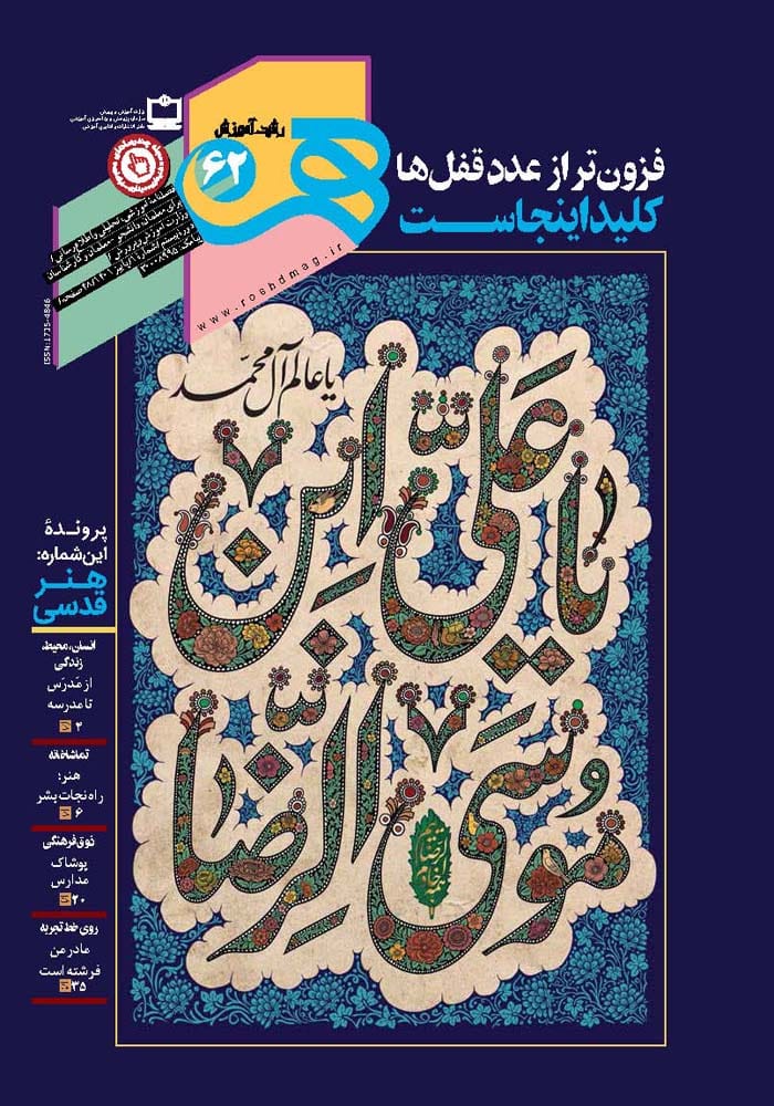 میگویند وقتی یک معلم هنر مشکلات ناشی از کار با گچ و رنگ روغنی را در دانشآموزانش مشاهده کرد، برای اولین بار «گچرنگ(پاستل) روغنی» را ابداع نمود. خُلق معلم این است که اصول پیچیده را به شکل همهفهم و همهگیر دربیاورد و تلاش کند مفاهیم قابلیت درک داشته باشند. آموزش گرههای هندسی، نقشهای تجریدی و فنهای(تکنیکهای) مرسوم هنری، چالشهای بزرگی هستند که وقتی پای مباحثی چون هنر مقدس و الهی پیش میآید سختتر هم میشود. به هر حال، ما در این شماره تلاش کردیم نمونههایی ارزشمند از آموزش هنر را ارائه کنیم که در مقدمه و نیت مقاله به بنیاد هنر مقدس پرداخته شده و در اصل مفاهیم آموزشی و کاربردی ارائه گردد. همان مفاهیمی که همه ما سالیان سال است در کلاس درس تدریس میکنیم. در واقع میخواهیم بگوییم اگر اصل، ریشه و نیتمان به سمت هنر الهی گرایش پیدا کند بر نتیجه آثار دانشآموزانمان تأثیری صدچندان خواهد گذاشت.