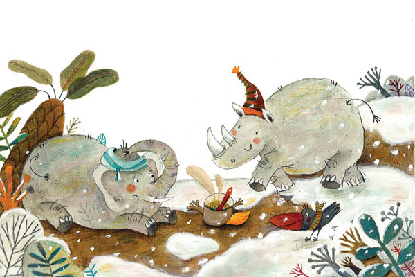 فیلو در را باز کرد. کرگدن که پشت در ایستاده بود، یکهو پرید عقب. میمونک جلو رفت تا ببیند چه اتفّاقی افتاده است. تا چشمش به فیلو افتاد، زد زیر خنده. فیلو سر و کلّهاش را با چند ملافه بسته بود. کرگدن جلو رفت و گفت: «این شکلی میخواهی بیایی برفبازی فیلو؟!»