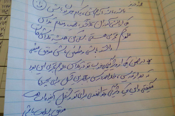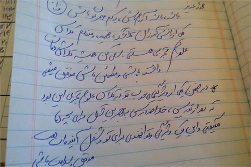 امروز سر کلاس علوم که رفتم، بعد از احوالپرسی از بچهها، یکی از دانشآموزان دفتر خاطراتش را روی میز گذاشت و خواست برایش یادگاری بنویسم. نوشتههای معلمان دیگر را هم نشانم داد. دفتر پر بود از دستخطهای زیبا و متنهای جالب، همراه با شعرهایی عالی و آرزوی موفقیتکردنهای همکاران زحمتکشم برای بچهها. بقیه بچهها هم دفترهایشان را روی میز گذاشتند. در این حین یکی دیگر از دانشآموزان هم دفترش را آورد، صفحهای را بازکرد و گفت: «آقا اینو بخونید.»