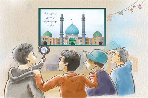 و به طرف تابلوی عکس مسجد جمکران رفت. روی آن نوشته شده بود «نیمهی شعبان بر همهی چشمانتظاران مبارک.»