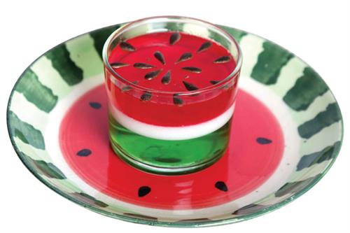 7. نوبت ژلهی هندوانهای است. بعد از سفتشدن ژلهی سفید، کمکم ژلهی هندوانه را هم به آن اضافه کن و توی یخچال بگذار.