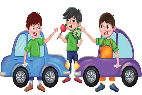 چراغ سبز و قرمز میشود. خودروهای آبی و بنفش هر دو برای خودشان قدم میزنند و بلندبلند فکر میکنند: «باهاش دعوا کنم؟ دعوا کنم؟ دعوا کنم؟»