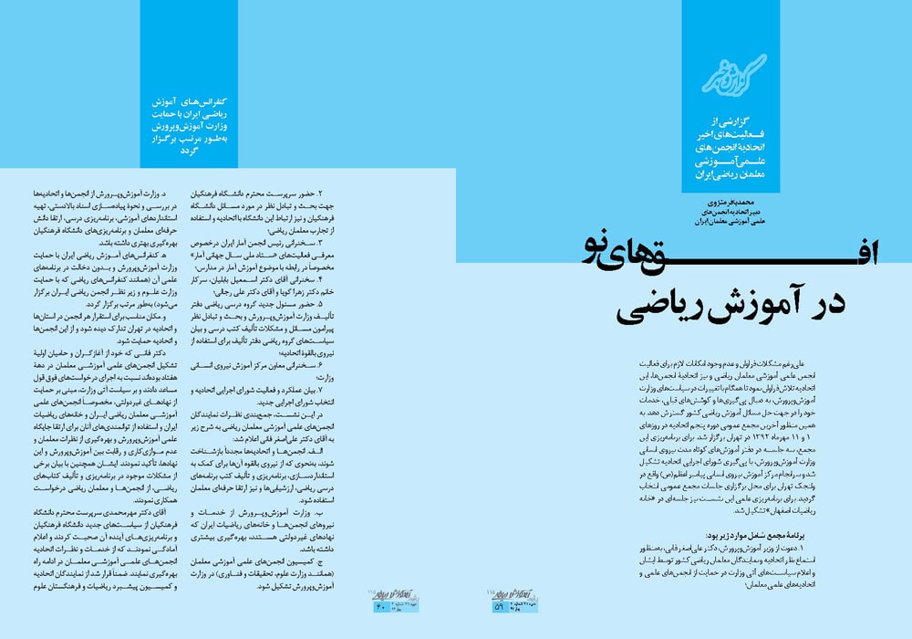 تاریخ و فلسفه ریاضی را در «رشد آموزش ریاضی» بخوانید دانش حرفهای معلمان ریاضی در رشد آموزش ریاضی رشد آموزش ریاضی برای معلمان ریاضی و کارشناسان وزارت آموزش و پرورش منتشر میشود به صفحه فصلنامه «رشد آموزش ریاضی» خوش آمدید گفتوگو حاج علیمحمد توکلیعلی رجالی؛ معلم ریاضی تجربه تدریس ترک اعتیاد در کلاس درس ریاضی!تدریس در کانکس با جئوجبراهندسه با طعم کووید ۱۹ دانش حرفهای بازی وارسازی در آموزش ریاضیراهبردی برای طرح مسائل دنیای واقعیدر ستایش علامت منفی گزارش گزارش مطالعه ۲۴ ام کمیسیون بین المللی تدریس ریاضیمدرسه تابستانی ریاضی