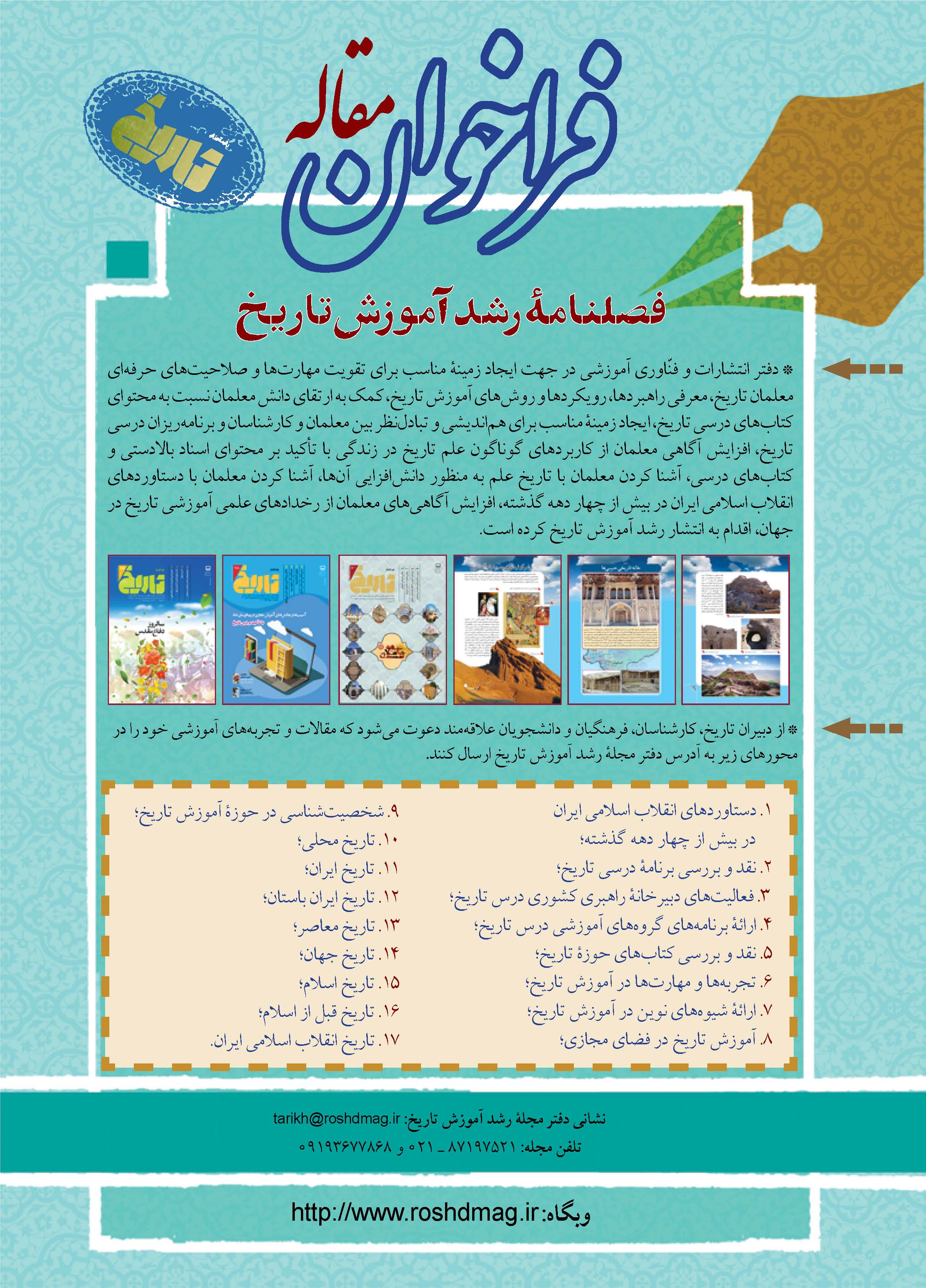 تاریخ ایران در رشد آموزش تاریخ رشد آموزش تاریخ برای معلمان تاریخ و کارشناسان وزارت آموزش و پرورش منتشر میشود به صفحه فصلنامه «رشد آموزش تاریخ» خوش آمدید گفت و گو کلاسهای مجازی و چالشهای آنکلاس مجازی تاریخ، تهدید یا فرصت؟ تاریخ معاصر ایران نقش سید جمالالدین اسدآبادی در بیداری مشرق زمینتکاپوهای آیتالله طالقانی (ره) در عرصههای سیاسی، اجتماعی و دینی ایران باستان حجاب در ایران باستانبررسی چند مجسمه دوره اشکانی در شهرهای هاترا، مالمیر و شوشخوراک در ایران باستان تاریخ ایران تفاوت «دیوان» و«درگاه» در دوره غزنویانرنسانس ایرانی در سدههای سوم و چهارم هجری قمری