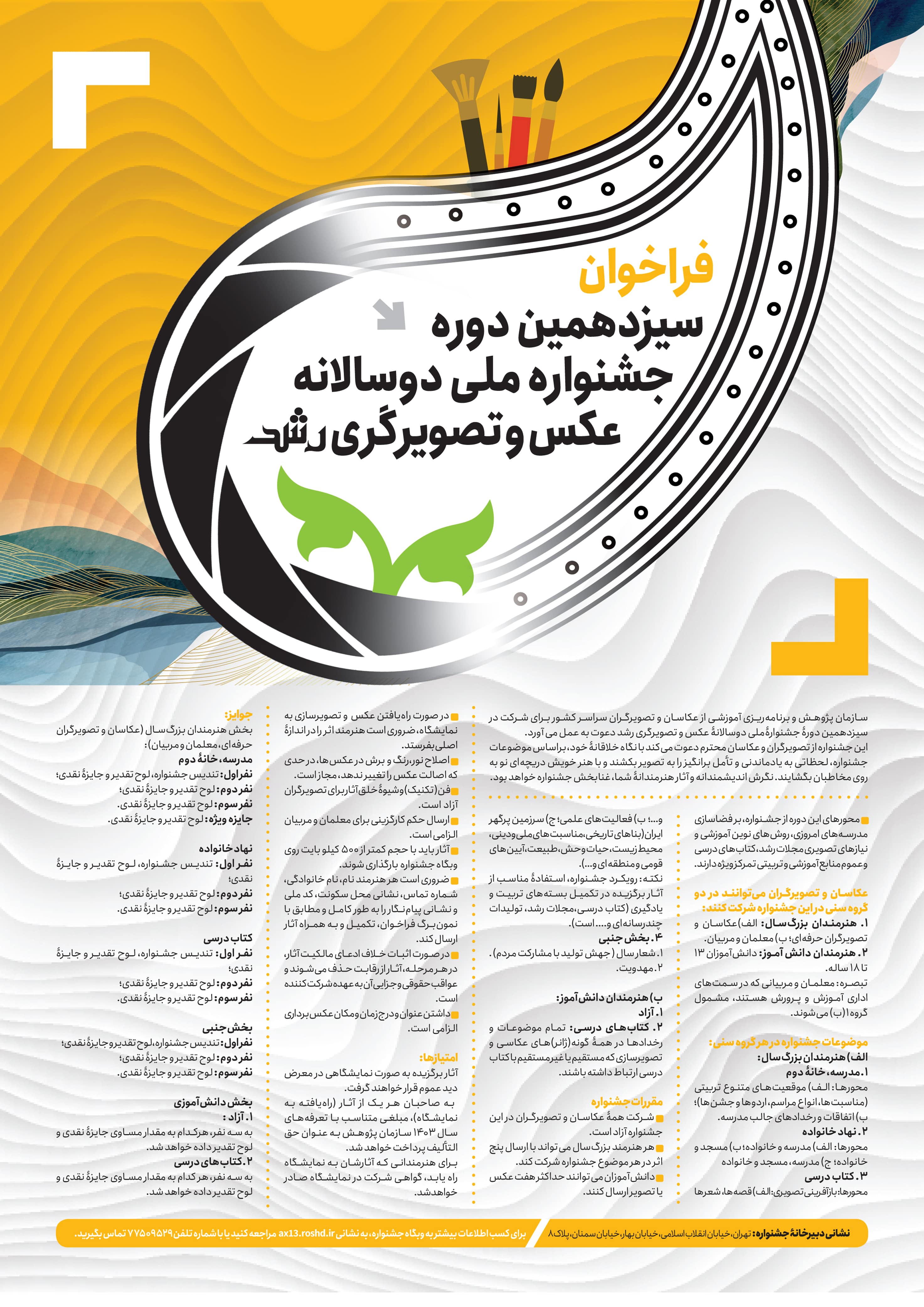 • آثار باید با حجم کمتر از 500 کیلو بایت، روی وبگاه جشنواره (https://ax13.roshd.ir) بارگذاری شوند.