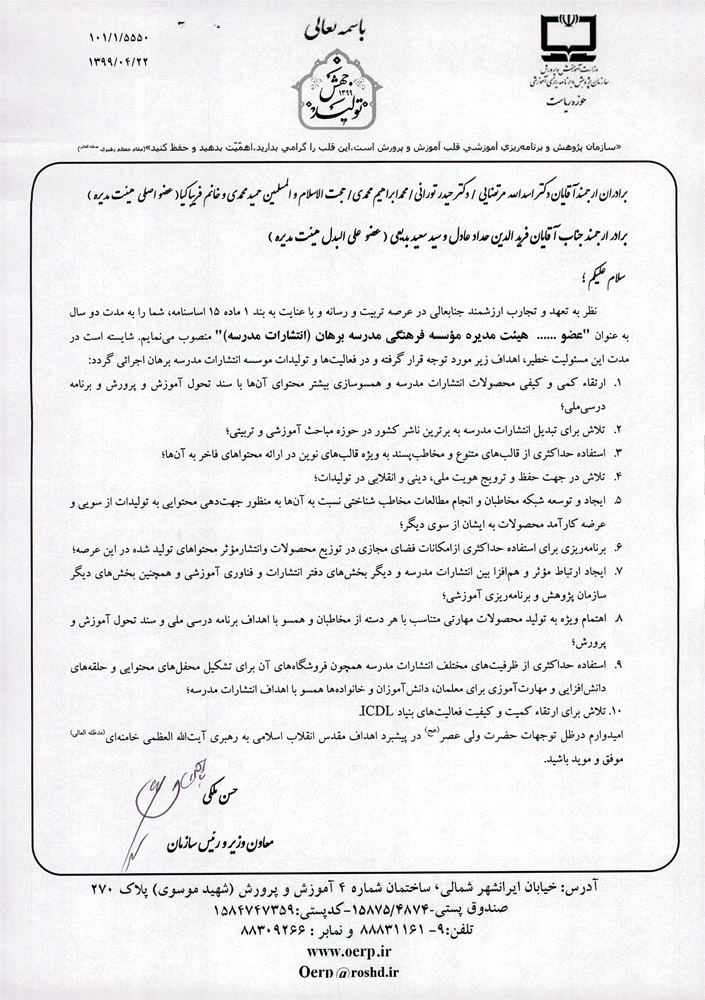 در بخشی از این ابلاغ آمده است: «شایسته است در مدت این مسئولیت خطیر، اهدافی چون ارتقای کمی و کیفی محصولات انتشارات مدرسه و همسوسازی بیشتر محتوای آنها با سند تحول آموزش و پرورش و برنامه درسی ملی، تلاش برای تبدیل انتشارات مدرسه به برترین ناشر کشور در حوزه مباحث تربیتی و آموزشی، ایجاد ارتباط مؤثر و همافزا بین انتشارات مدرسه و دیگر بخشهای دفتر انتشارات و فناوری آموزشی و بخشهای دیگر سازمان پژوهش و برنامهریزی آموزشی و... اجرایی گردد.»