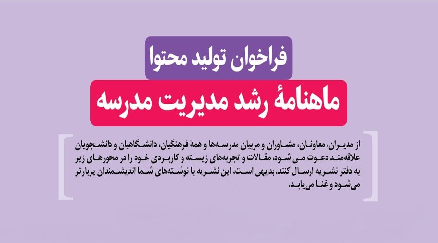 دفتر انتشارات و فناوری آموزشی فراخوان تولید محتوا برای ماهنامه رشد مدیریت مدرسه را منتشر کرد.