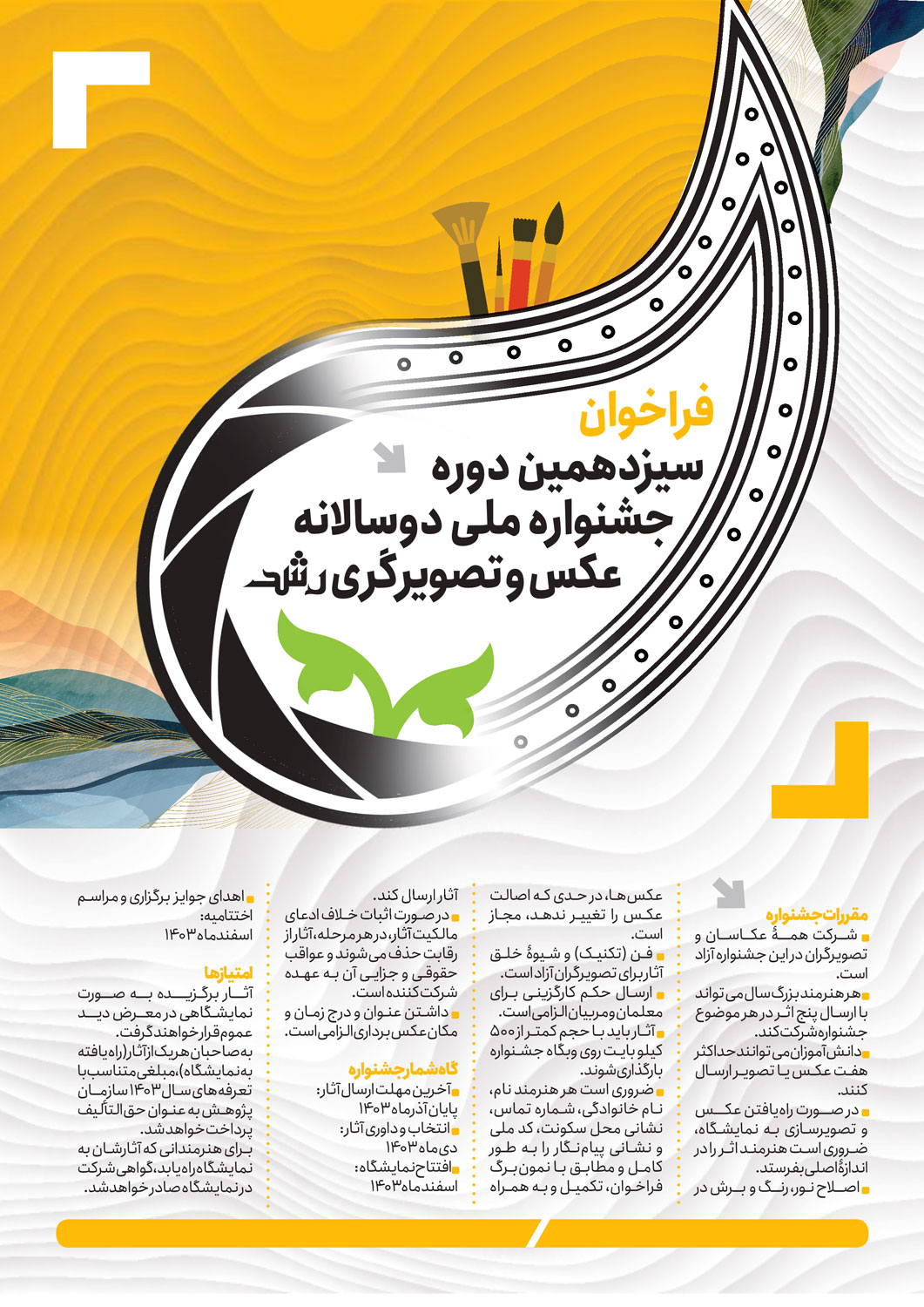 سازمان پژوهش و برنامهریزی آموزشی در این فراخوان از عکاسان و تصویرگران سراسر کشور برای شرکت در سیزدهمین دوره جشنواره ملی دوسالانه عکس و تصویرگری رشد دعوت به عمل آورده است.